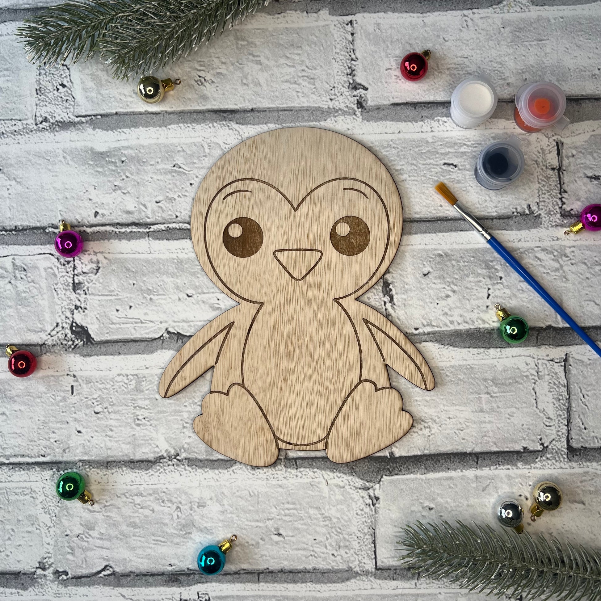 Plywood penguin shape with three paint colours (this can be a random selection or you can choose) and a paint brush.