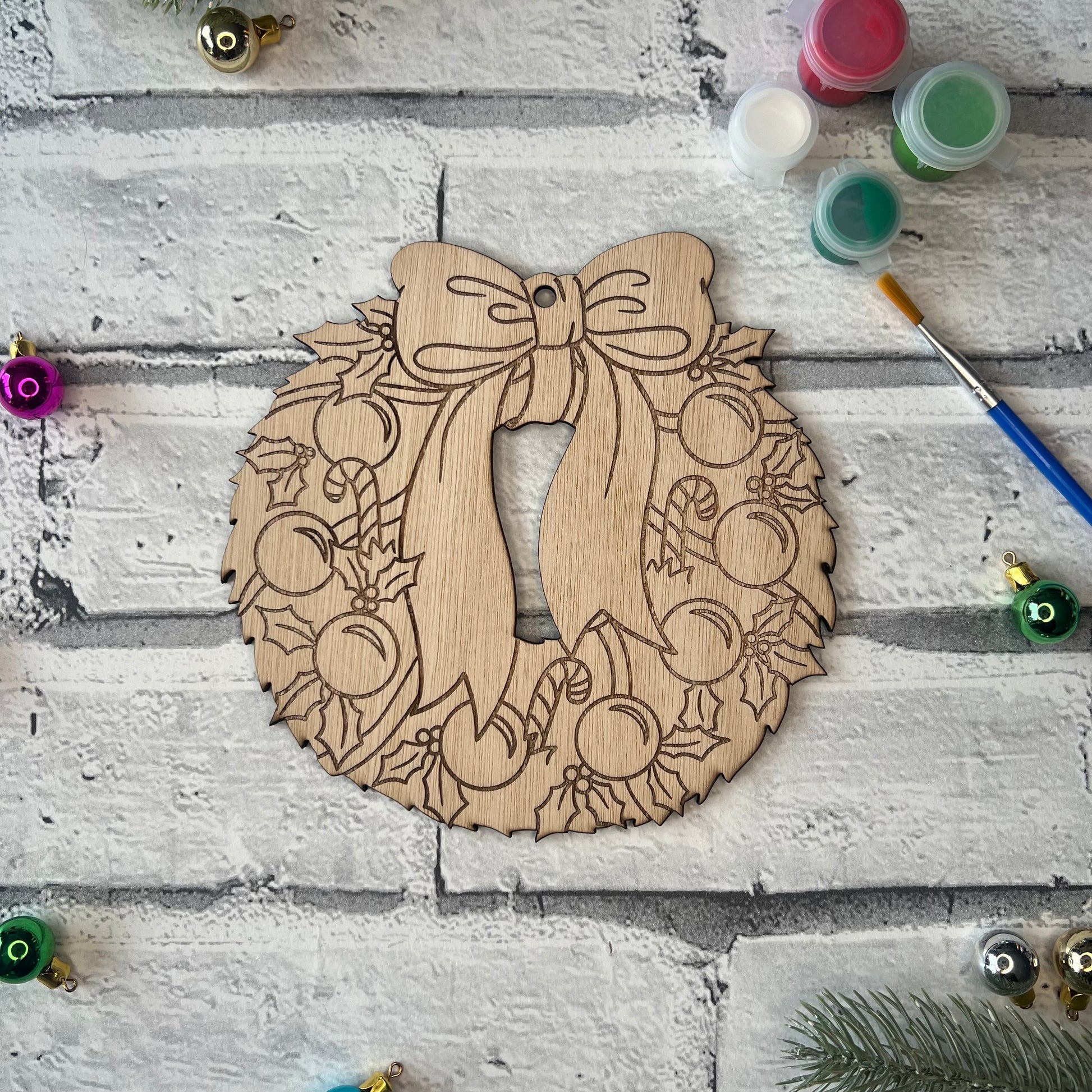 Plywood wreath shape with three paint colours (this can be a random selection or you can choose) and a paint brush.