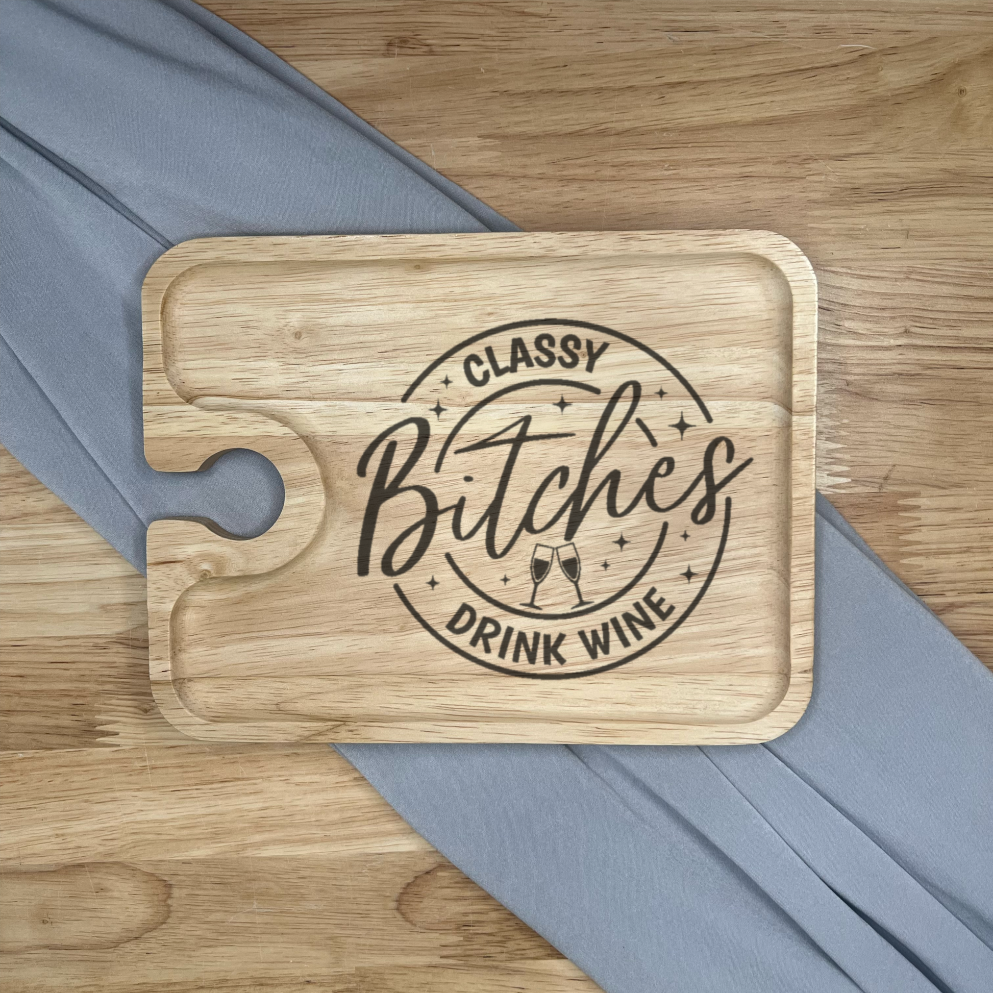 Wooden wine and nibbles tray with laser engraved on the top 'Classy Bitches Drink Wine'. The tray has a cut out for a glass stem to fit into.